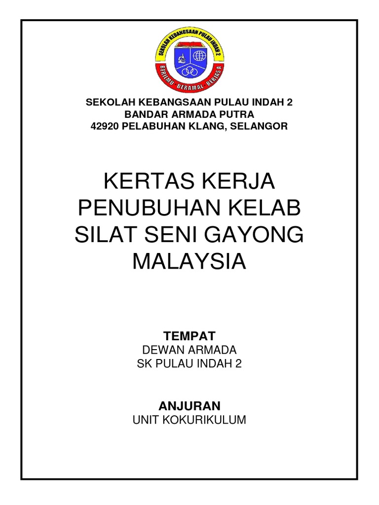 . PENUBUHAN GELANGGANG PERTUBUHAN KELAB SENI SILAT GAYONG MALAYSIA SEBAGAI AKTIVITI. Contoh kertas kerja berikut adalah penting sebagai rujukan anda yang ingin melakukan sesuatu seminar kerja atau projek. SEKOLAH KEBANGSAAN PULAU MERANTI 47100 PUCHONG SELANGOR DARUL EHSAN KERTAS KERJA FASA 4 ANJURAN.